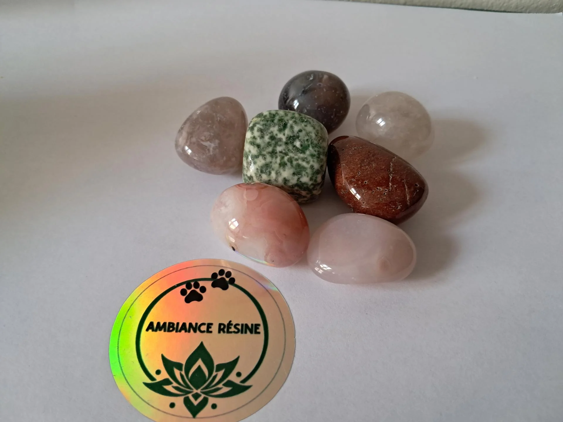 7 Pierres roulées entre 2 et 3 cm...Agate arbre, Botswana, fleur de cerisier,laiteuse Botswana, bandée rouge, orange et violette de Madagascar.