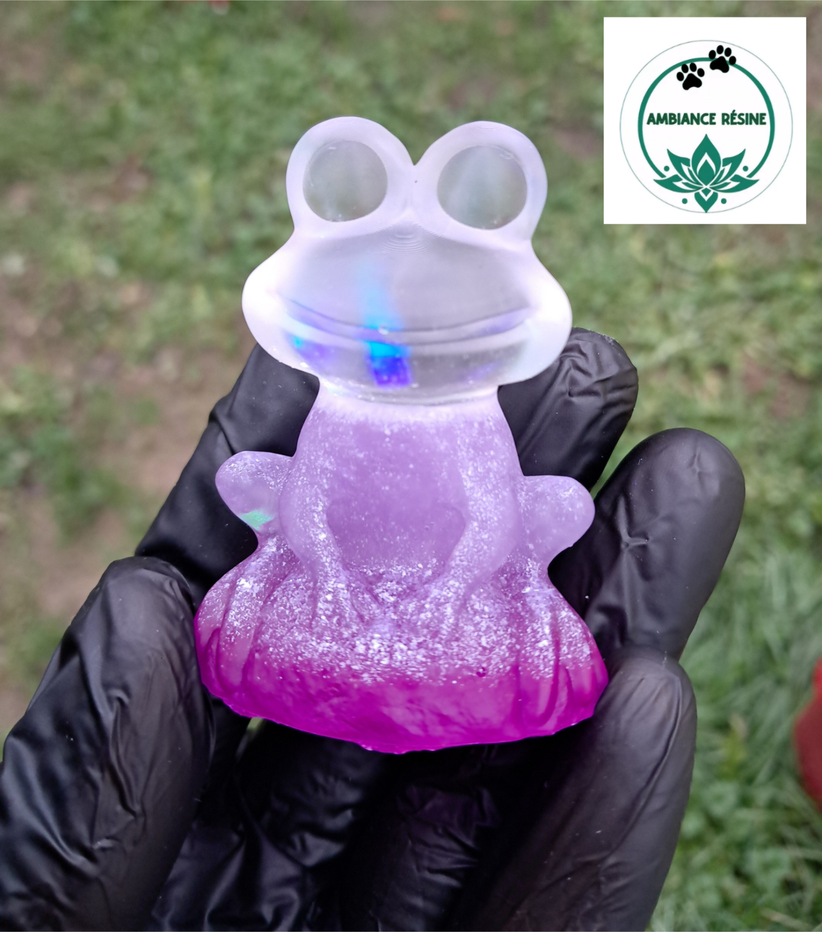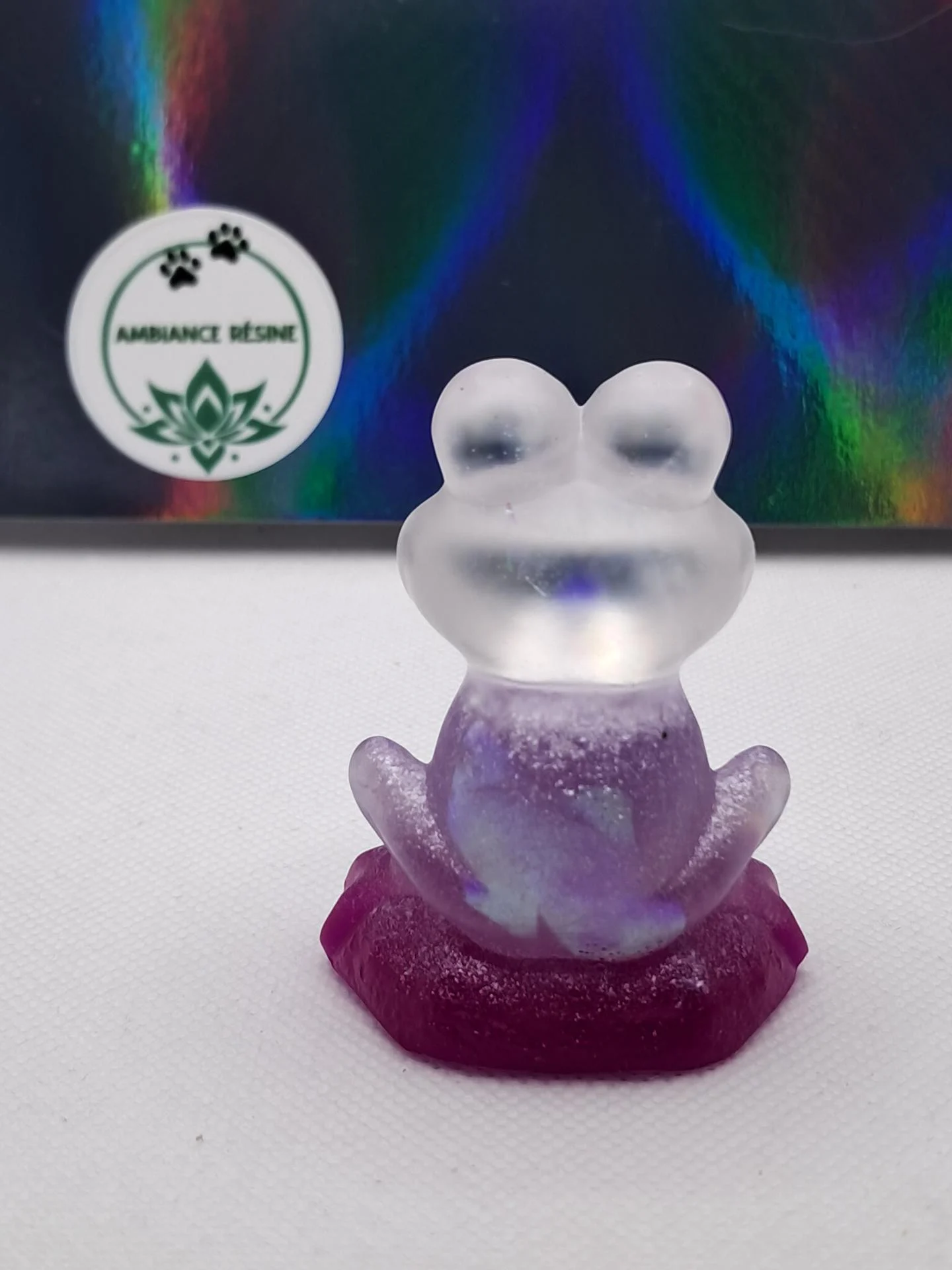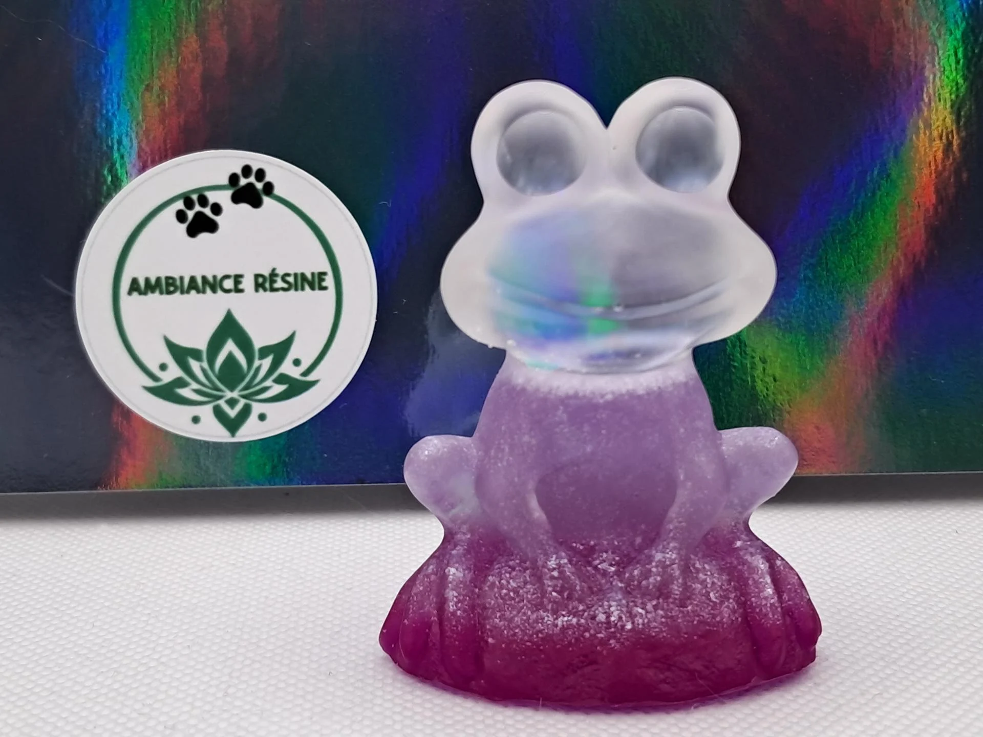 Grenouille tête holographique et corps violet, petit prix car petite bulle sur la bouche.