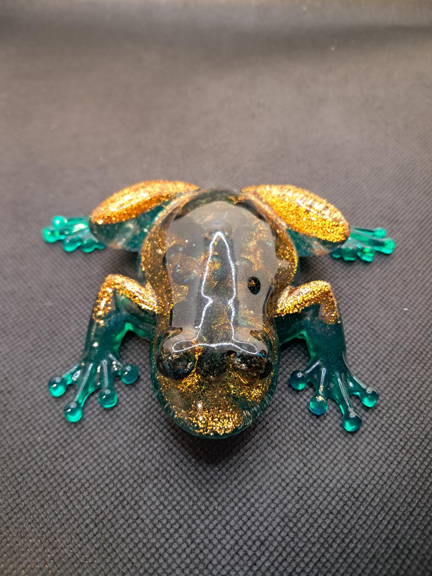 Grenouille verte à paillettes dorée, inclusion dd perles.