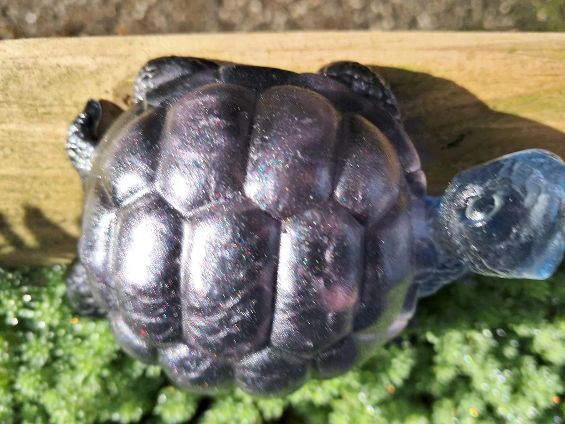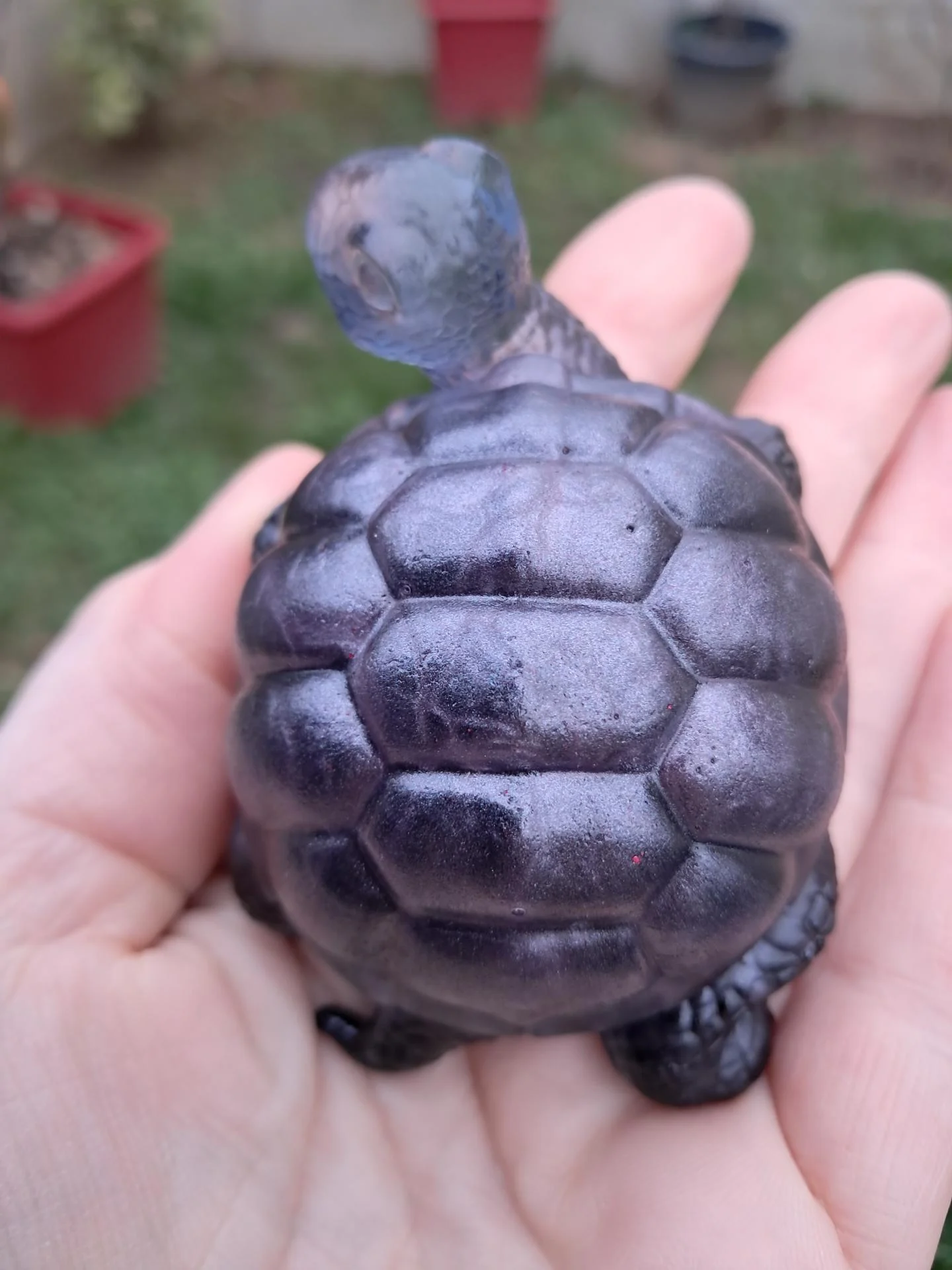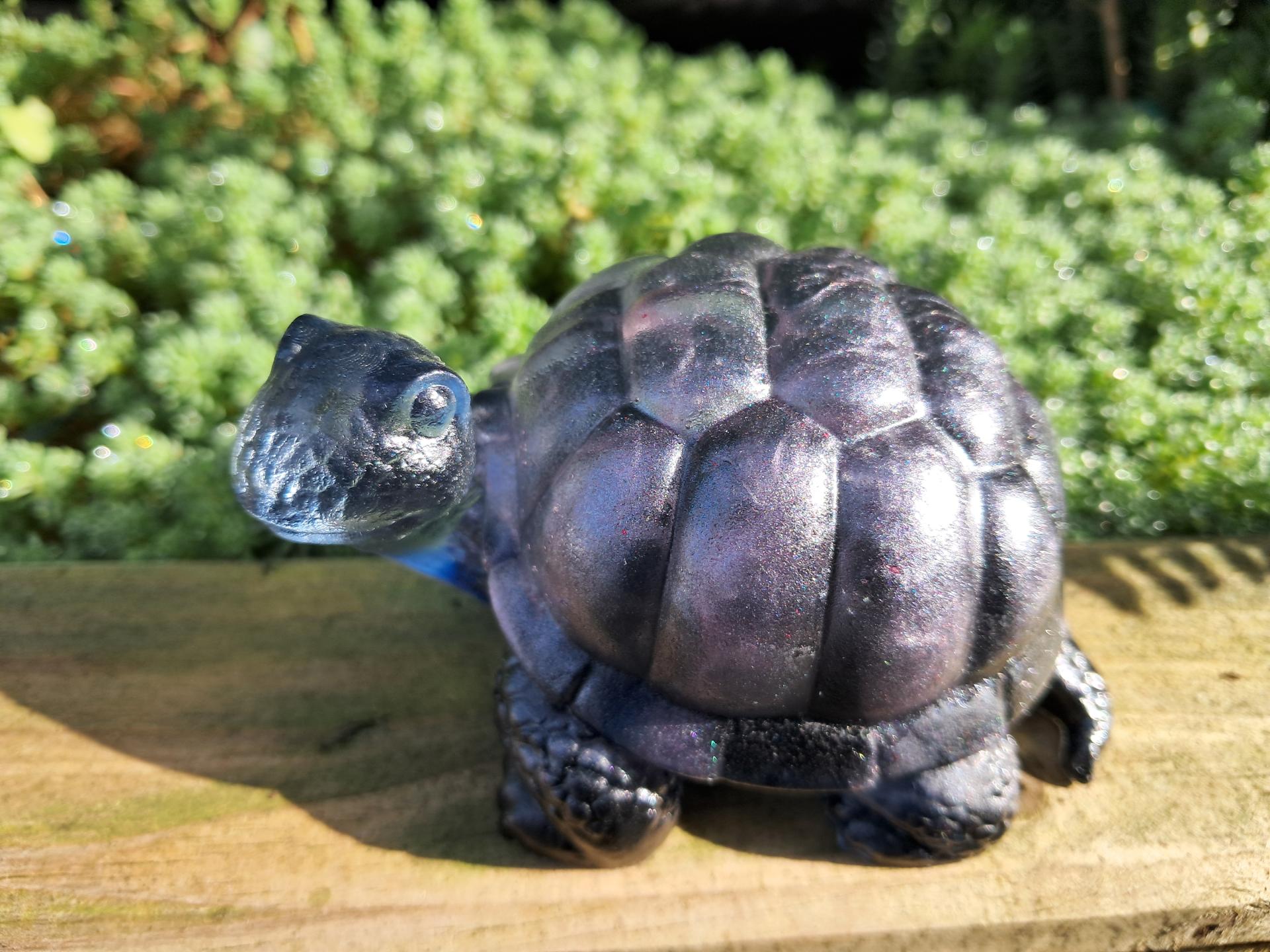 Tortue noire, corps transparent et carapace noire à reflets roses effets irisés.